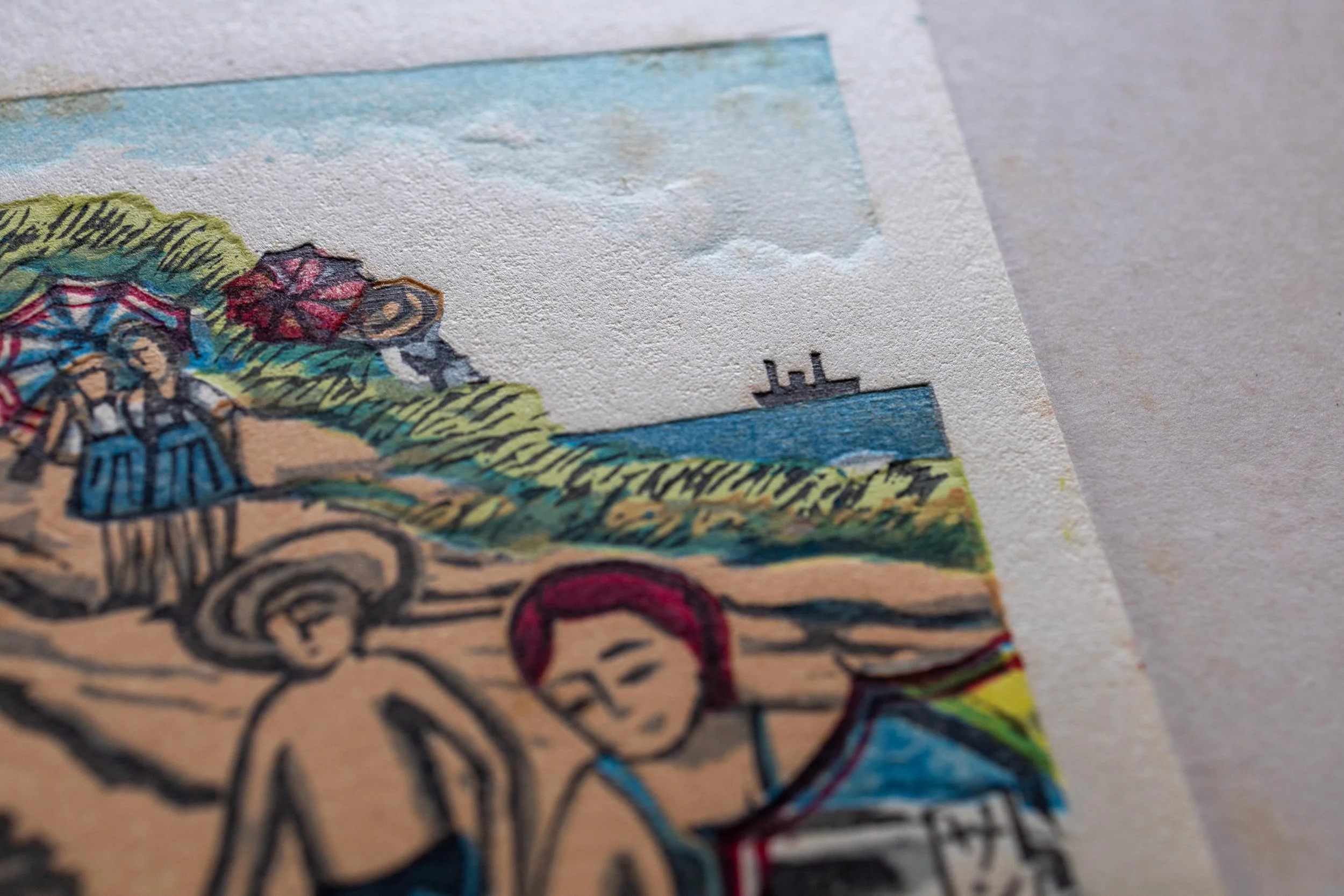 版画の中の絵と同じような青い海が見えた。